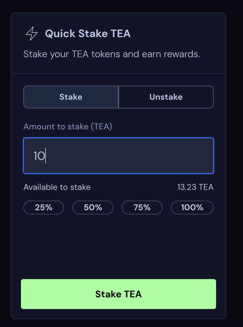 3. Input the amount of TEA you would like to stake and hit the “Stake TEA” button.
